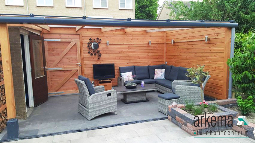 Luxe vrijstaande Douglas veranda met staanders en dwarsligger van 12x12cm dik of optioneel met 14cm dik. Een profielsysteem met sierklik lijsten in antraciet, zwart of wit en Lexan polycarbonaat plaat verkrijgbaar in opaal en helder.